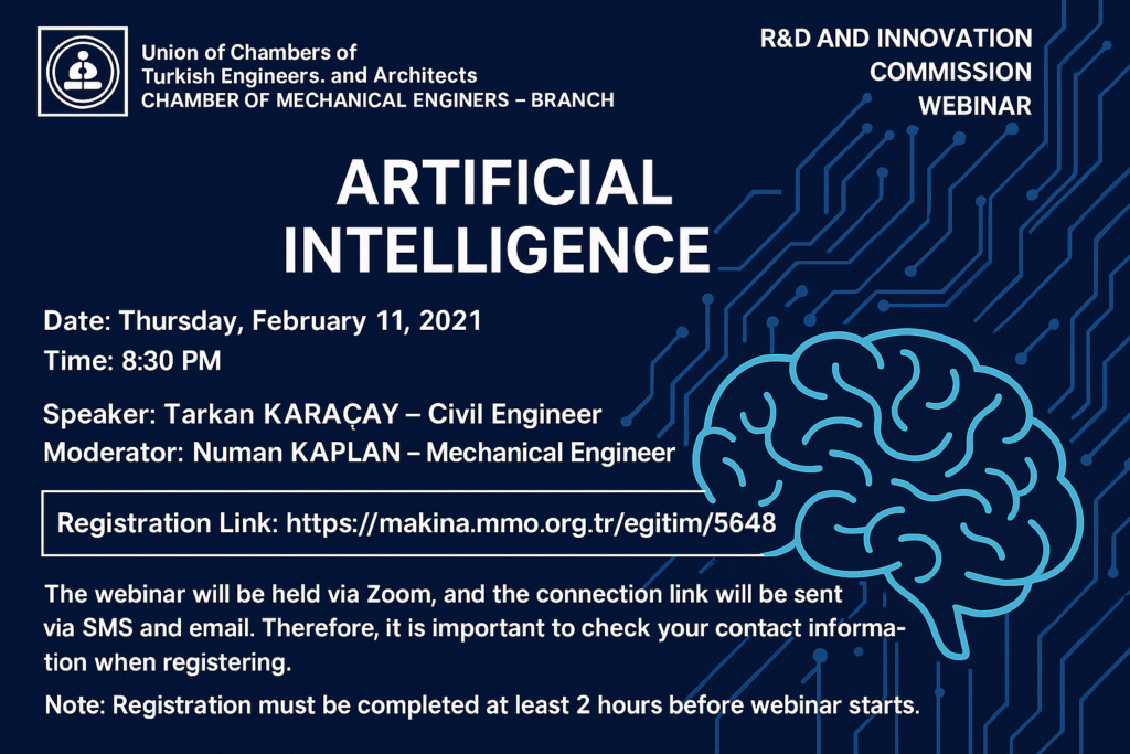 I delivered an online webinar for the Bursa Branch of the Chamber of Mechanical Engineers, focusing on the integration of Artificial Intelligence within the framework of Society 5.0.